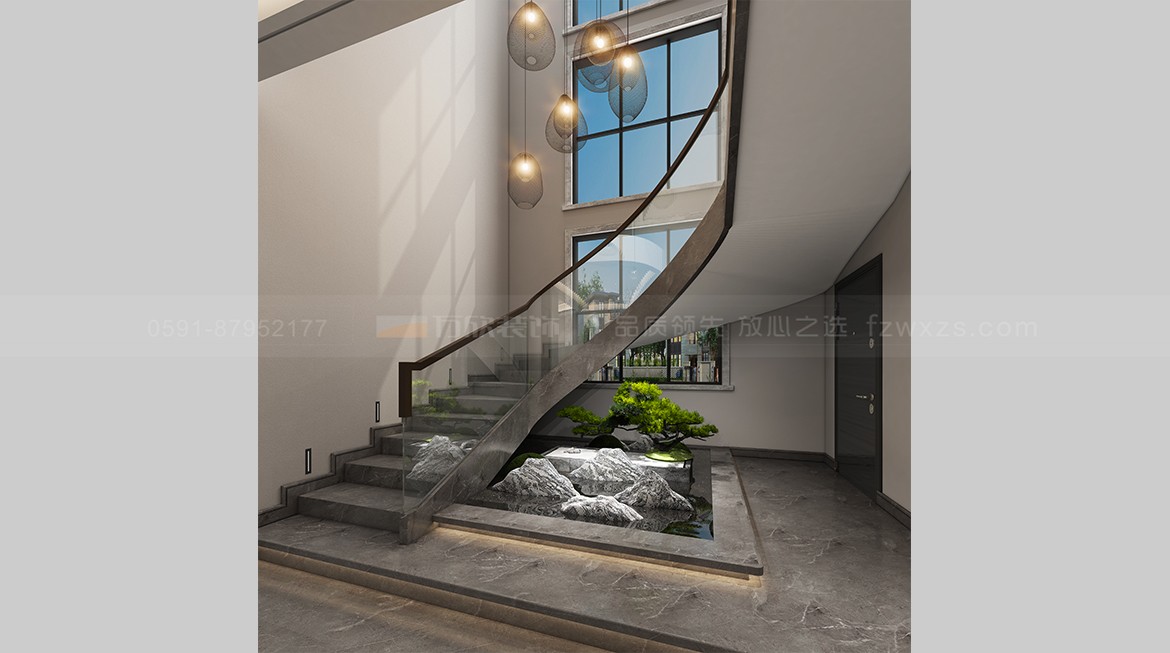 以灰色為主色調(diào)的樓梯踏步,山水景與空間完美結(jié)合,飾以光影藝術(shù),兼容并蓄、融情于景。